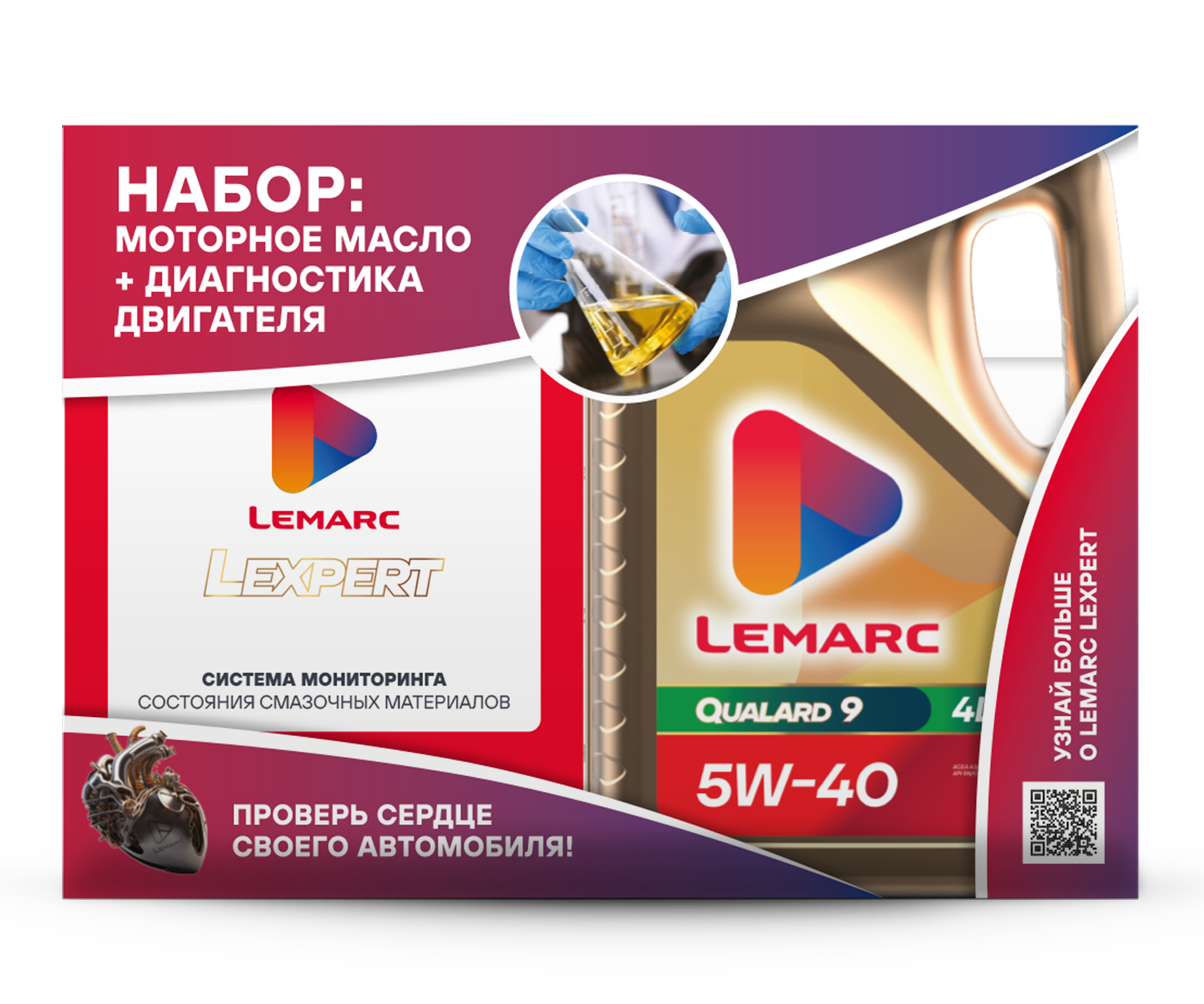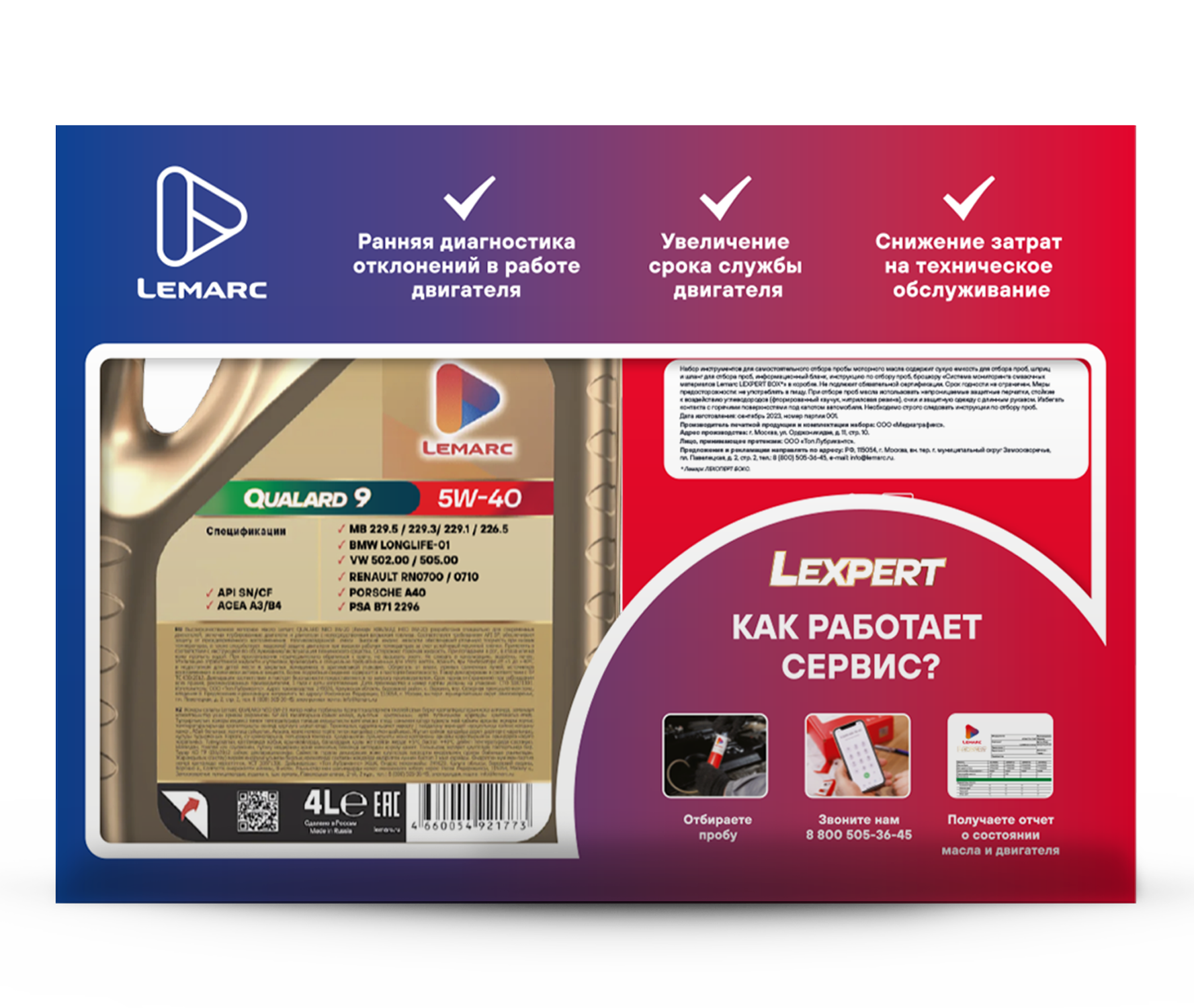 Набор содержит высококачественное синтетическое всесезонное моторное масло Lemarc QUALARD 9 5W-40 4л в промо упаковке с набором инструментов для самостоятельного отбора пробы моторного масла «Система мониторинга смазочных материалов Lemarc LEXPERT BOX».